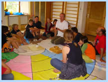 Entstehung:Die Wurzeln meiner Arbeit oder wie alles begonnen hat.Mein besonderes Anliegen ist es, die Mathematik aus den Klassenzimmern, den Hörsälen und den Köpfen zu befreien - sie in den Wald, auf die Straße, in den Turnsaal, den ganzen Körper zu bringen. Mein Vorhaben ist es, die Dinge spürbar, begreifbar und erlebbar zu machen. Mein Bestreben ist es, die Grundlagen der Mathematik neu zu sehen, sichtbar zu machen: in Farbe, Form und Klang zu kleiden, und sich in dieser wunderbaren Sprache auszudrücken, und zu finden. Mathematik, mit all ihren Facetten, zu genießen, und mit reiner Absicht zu erforschen - das sind die Wurzeln und das letztendliche Ziel meiner Arbeit. Das freie Spiel, das spielerische Forschen, die Freude an der Unendlichkeit der Möglichkeiten, ermöglichen uns diesen umfassenden Zugang. Der Vorgang des Rechnens ist Bewegung. Ich mache dies sichtbar. MatheomatikMatheomatik ist eine Spielweise der Mathematik, die den ganzen Menschen in Körper Seele und Geist voll einbezieht. Es geht darum, die Mathematik zu einem sinnenfrohen, freudigen Ereignis werden zu lassen, das mit einem frohen, leichten und aufbauenden Gefühl verbunden ist. Dazu braucht es eine völlig neue Sichtweise von „Lernen“. Die Beschäftigung mit Mathematik soll freiwillig, ohne Bewertungen von außen und ohne vorgegebenen Plan erfolgen, ohne Angst und Druck, denn erst so kann sich Kreativität und echtes Lernen entwickeln. Matheomatik ereignet sich auf großen Spielplätzen, drinnen wie draußen, die TeilnehmerInnen sind umgeben von Mathematik, und lassen sich von den verschiedenen Themen ansprechen und beschäftigen sich mit frei gewählten Themen. Begleitet werden sie von „Lehrern“, die sich selbst für die Mathematik begeistern und schon sehr viel gespielt haben, die Inhalte schon in sich neu erschaffen haben. Sie unterstützen Prozesse, begleiten eventuell auftauchende Widerstände, und sind da, die Matheomatische Umgebung vorzubereiten. Die Matheomatische UmgebungWie schaut ein vorbereitete Umgebung für Mathematik aus? Mathematik ist die Suche - oder besser: das Finden von Strukturen. Die Verständnisstrukturen bauen sich auf, indem man tut, aktiv wird und am besten mit dem ganzen Körper und mit alles Sinnen. Deshalb gibt es sehr viel Material, mathematisches Spielzeug sozusagen, Holzperlen, Bälle, Stangen, Hütchen, Bretter, große Spielfelder (Matheomatik-Arena, Matheomatik-Stern), Koordinatensystem, Kreise, Körper…. Gesättigt mit diesen Erfahrungen und der aufbauenden, freudigen Emotion, ist dann die formal-abstrakte Phase, ein Genuss. |